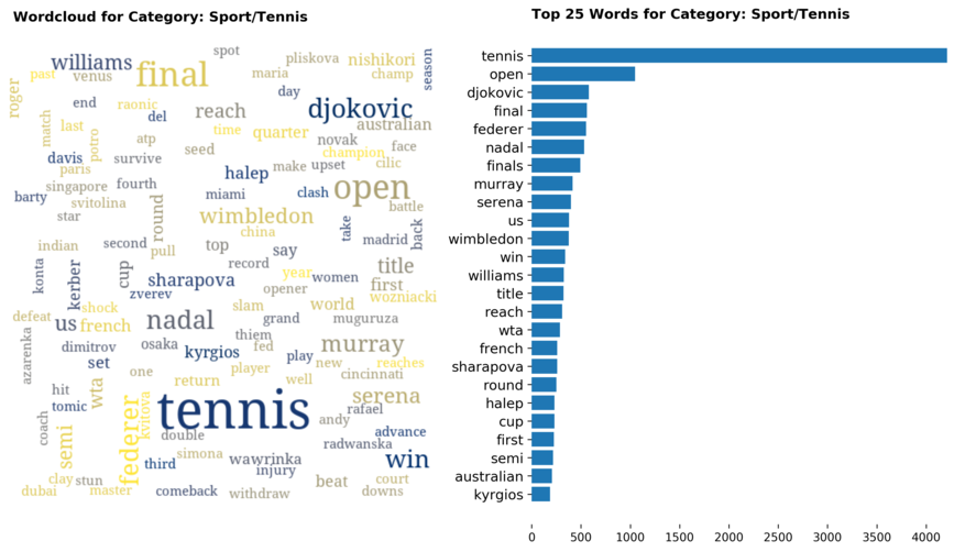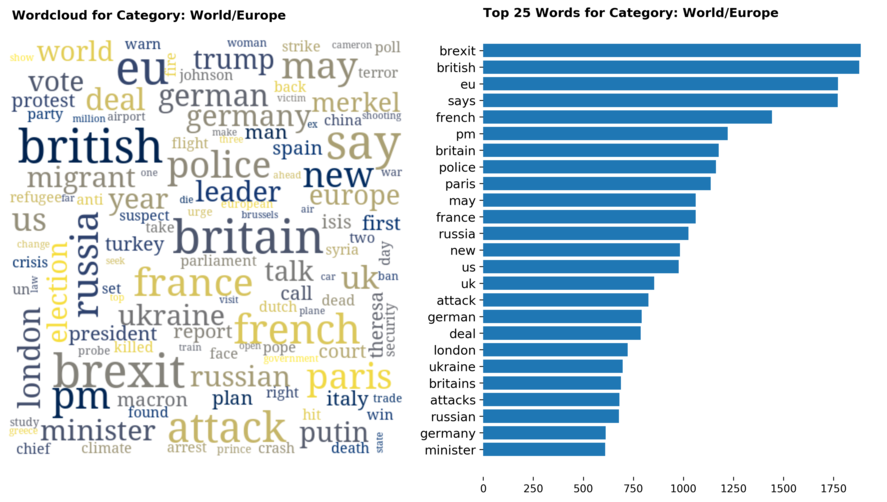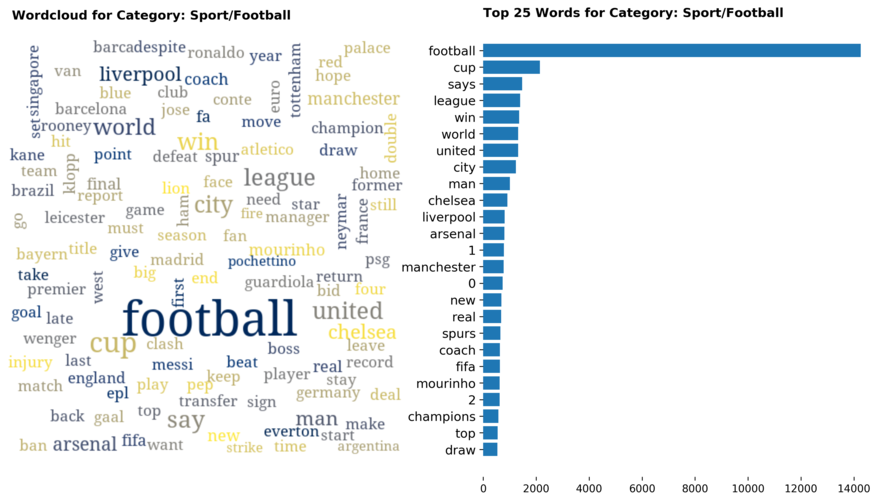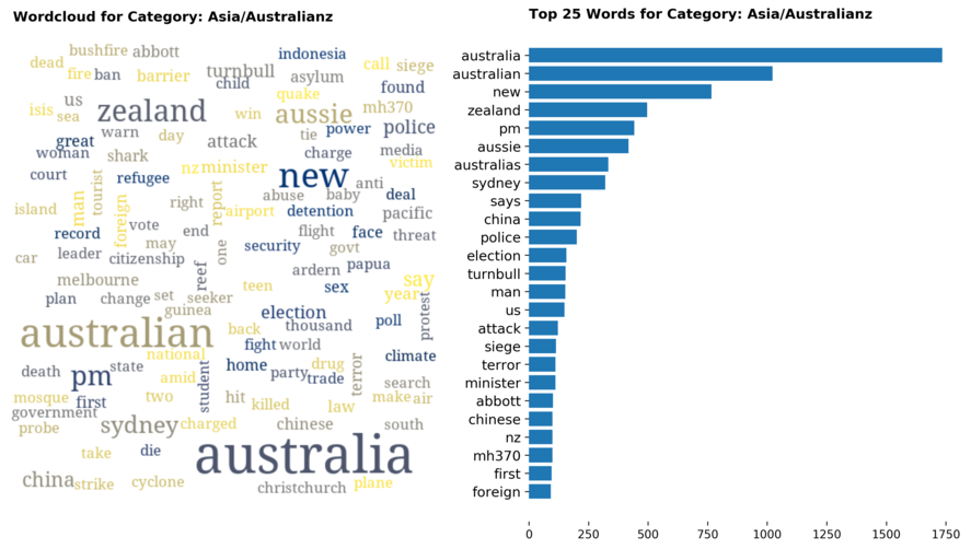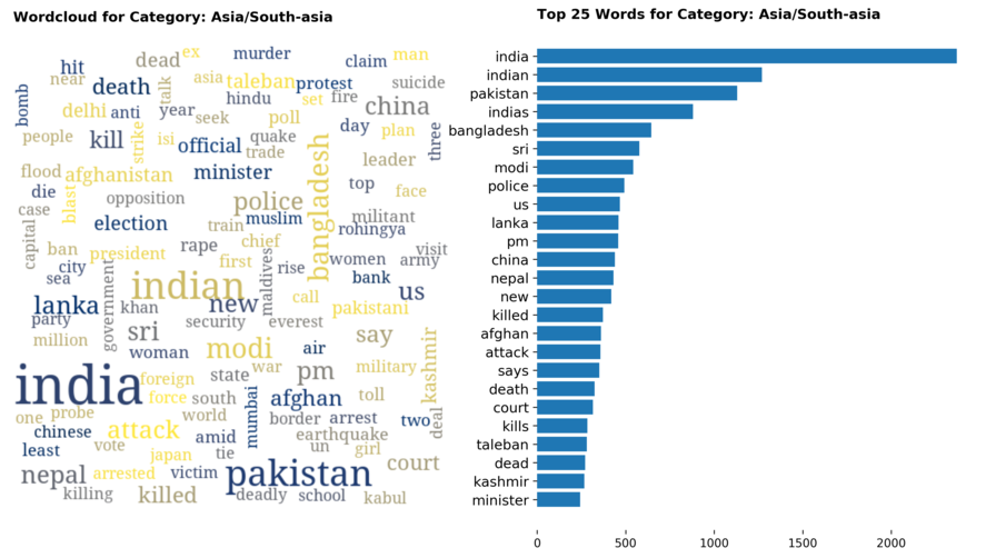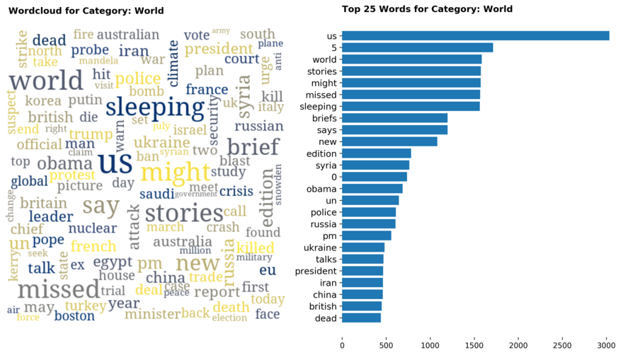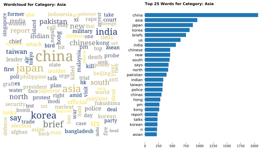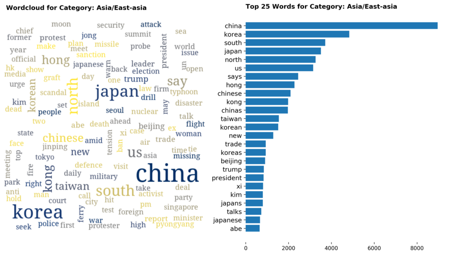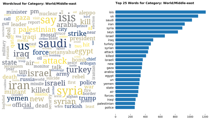 Diving into each category, we look at what are the most common words that characterizes the top 25 news segments. Click the sub-category titles below to see the corresponding word cloud.