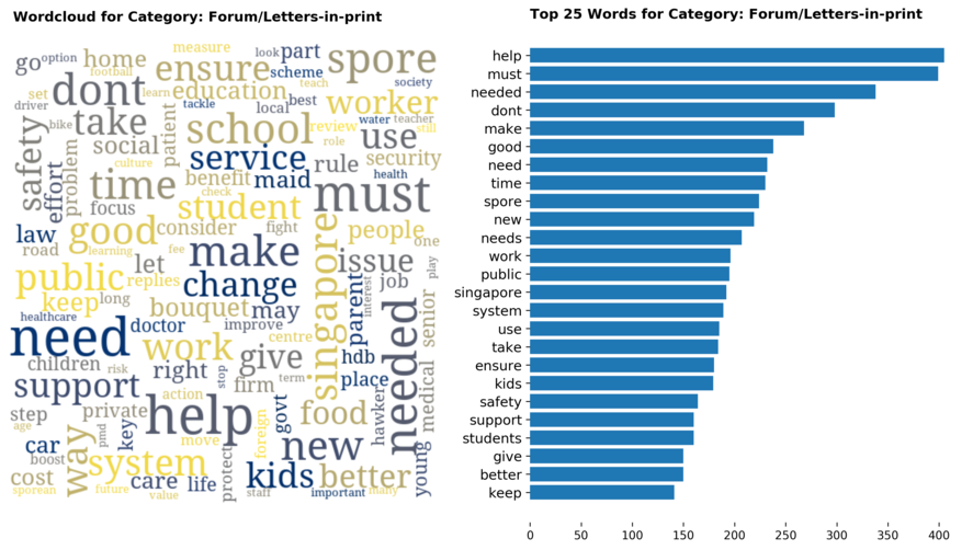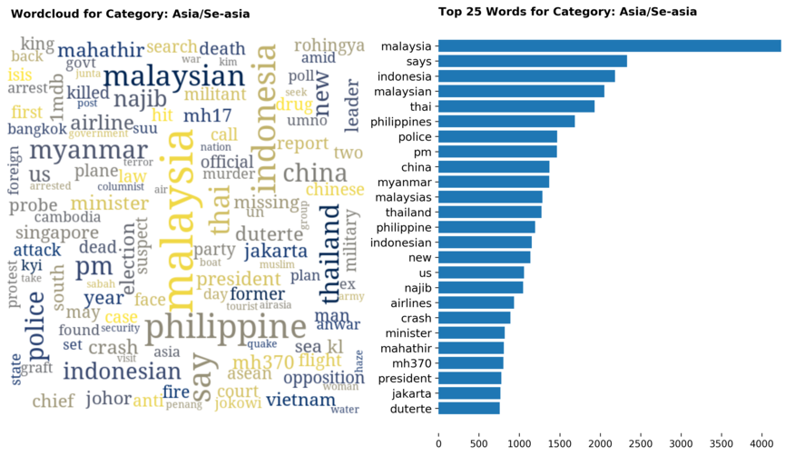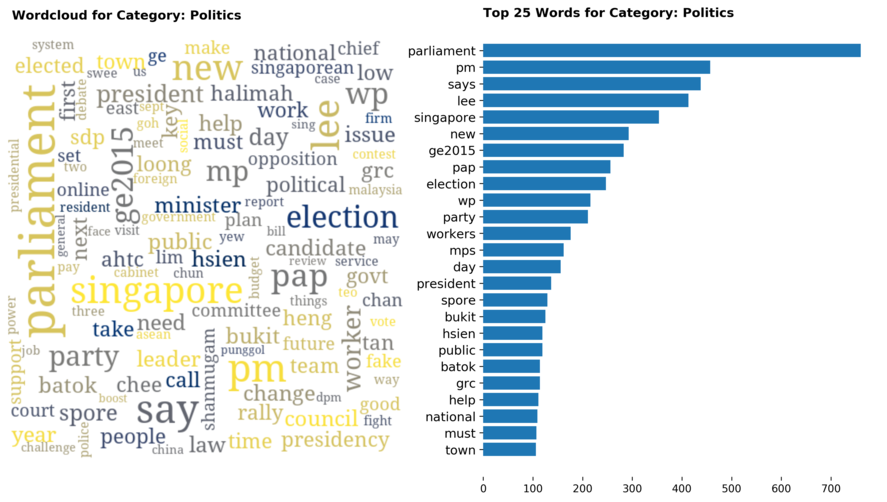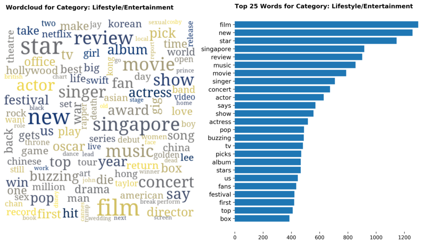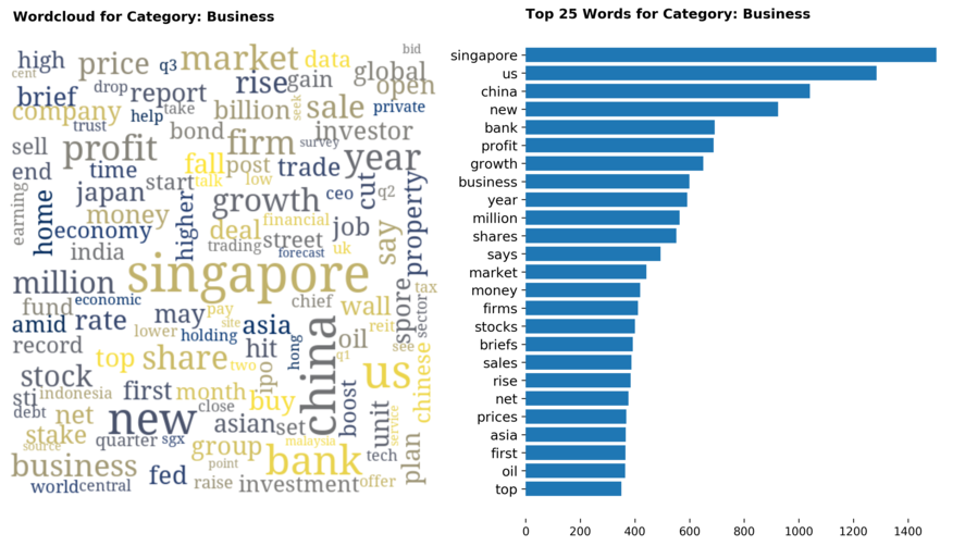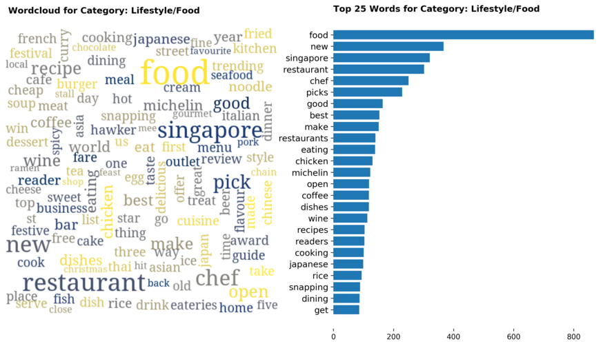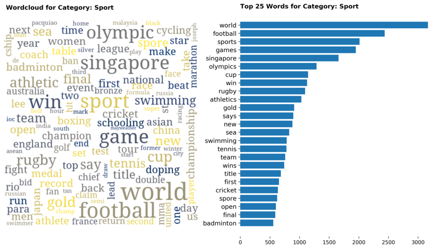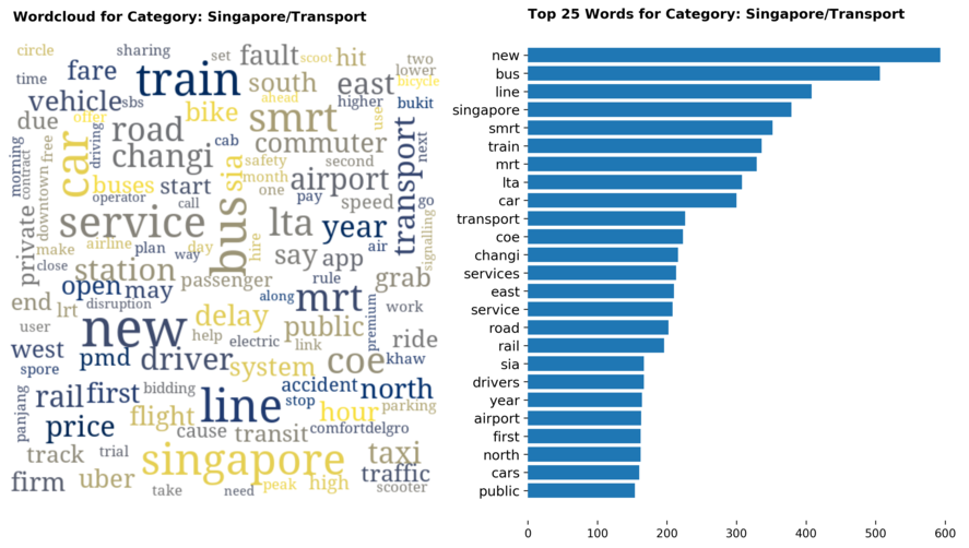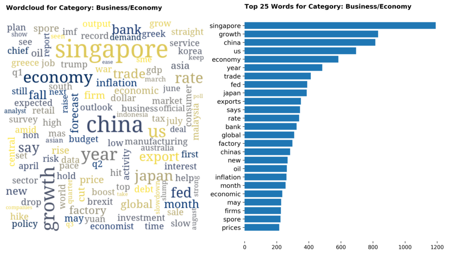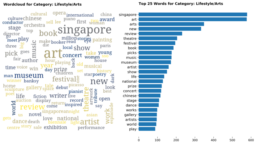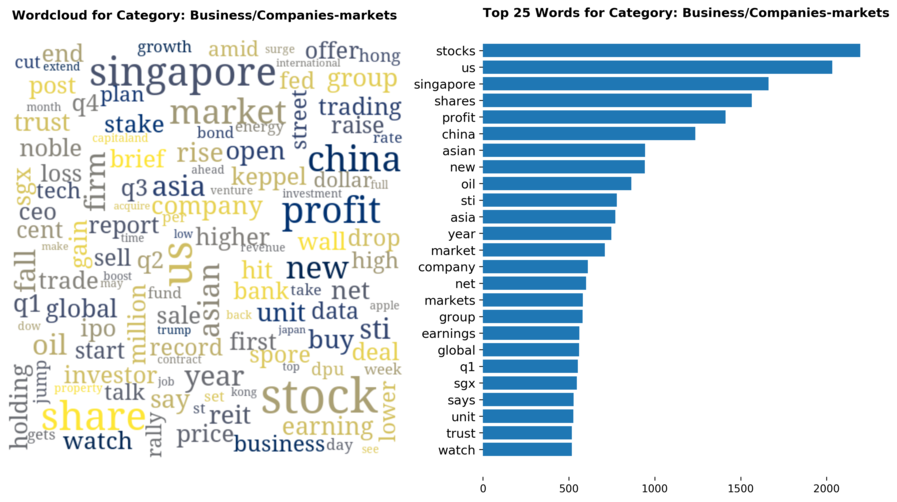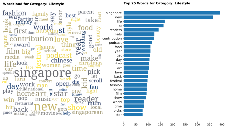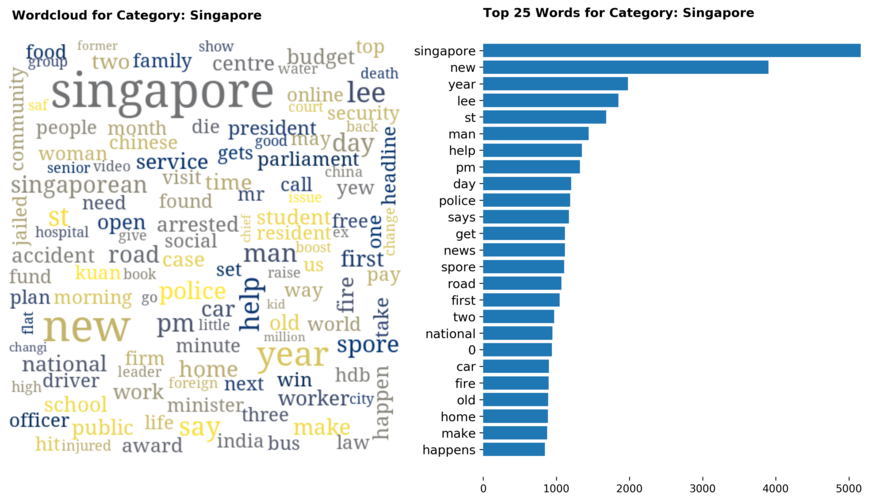 Exploring the dataset by category, there are a total of 70 categories (including sub-categories) with 'Singapore' news being the largest, taking up 12 percent of all articles.
