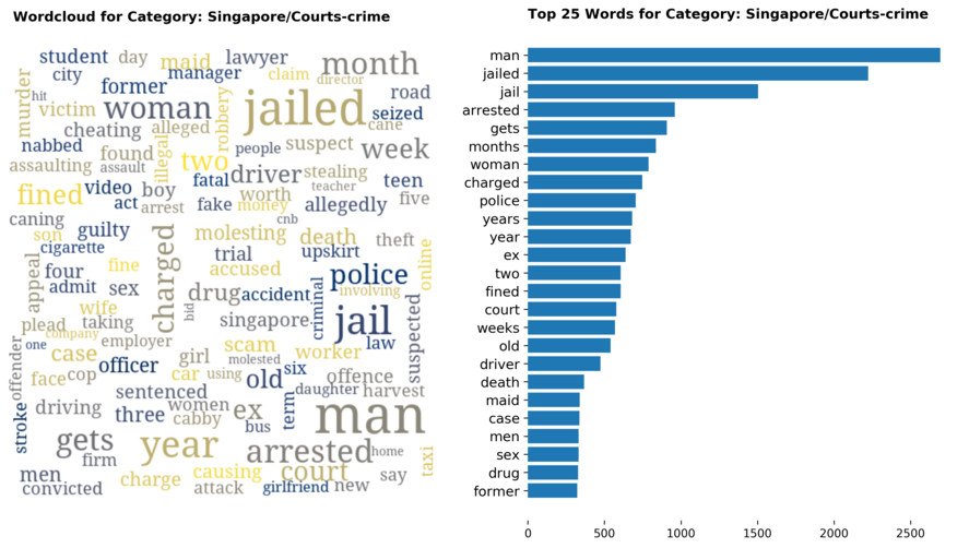 While most top keywords in the categories are quite predictable, one interesting finding would be that the most common word for the crime news segment turns out to be man. It is more than twice as likely to appear as compared to the word woman. How would this finding look like juxtaposed against official reported crime rates by gender in Singapore?